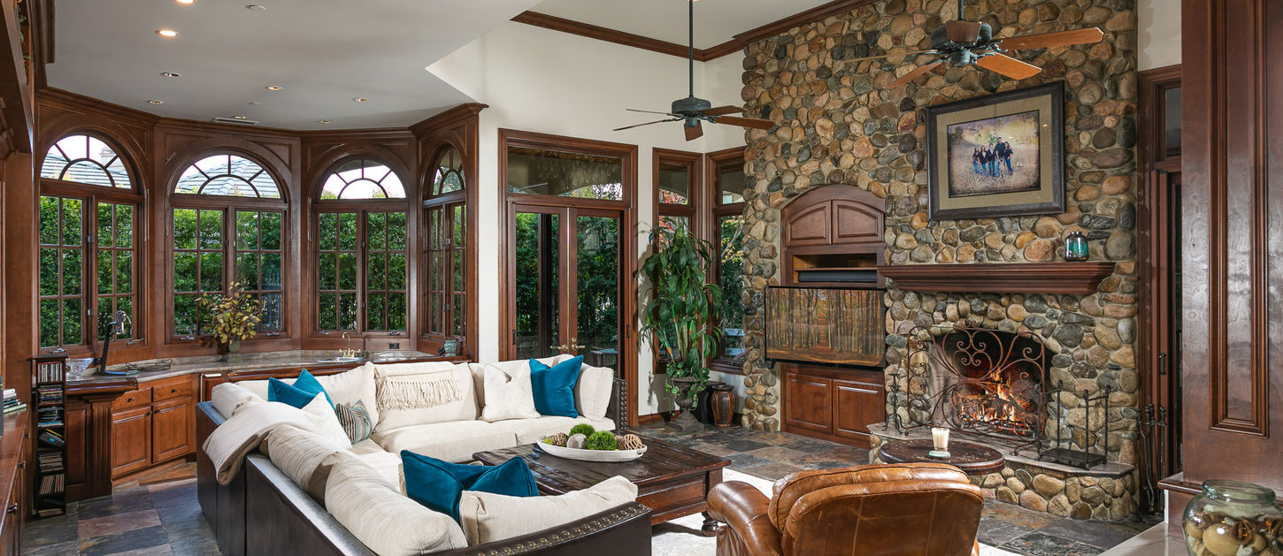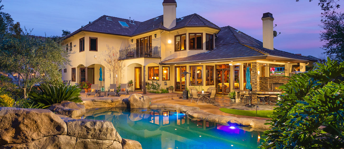 Experience luxury living at its finest in the grand family room with soaring ceilings, built-in sunken bar, and rock fireplace. Surrounded by double French doors and windows, the warm and inviting family room lead to the spacious fully equipped California room and outdoor dining space. The Master Chef's recently remodeled kitchen boasts Viking 6 burner stove, Subzero refrigerator, dual dishwashers, custom cabinetry, Quartzite creamy light countertops, coffee bar, walk-in pantry and a 200+ bottle wine cellar. The private office is located just off the main entrance adjacent to a gorgeous formal living space. Downstairs includes a guest bedroom and oversized laundry room. Make your way upstairs to the romantic Master Suite with sitting area and balcony to enjoy the resort-like grounds and sunset views. The fully remodeled Master bath is like a luxurious spa featuring marble, soaking tub, walk-in shower, vanity area and his and her walk-in closets. Two large en-suite bedrooms plus bonus/loft complete the upper level.